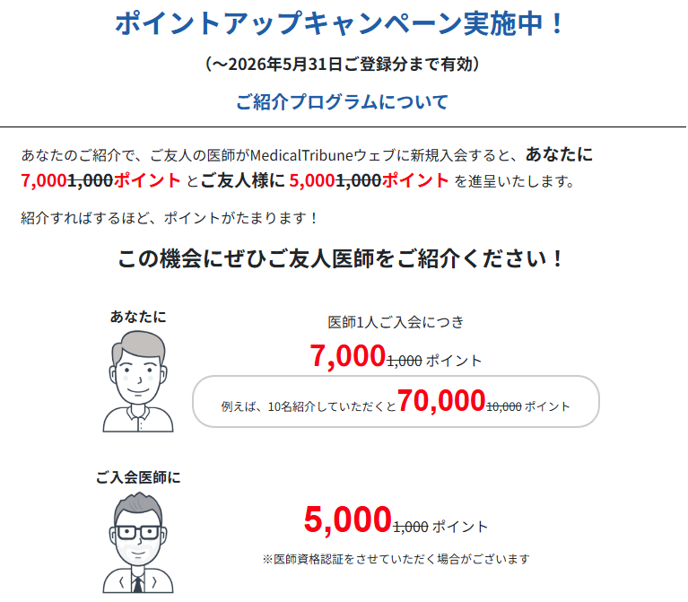 - Medical tribuneで2026年5月31日までの期間限定で、紹介者5,000pt、登録者7,000ptが増量しています。